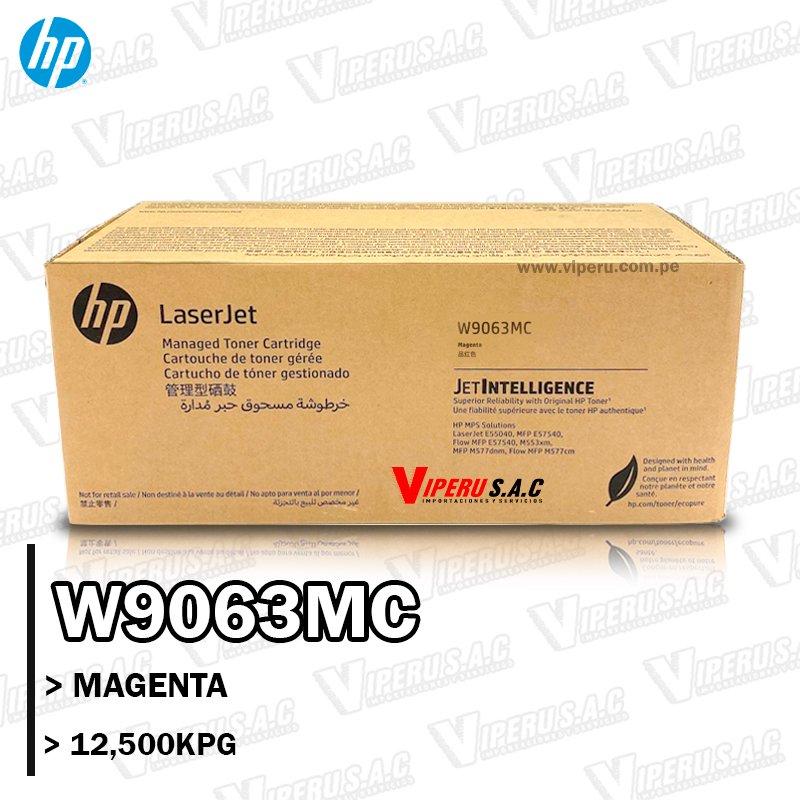 El tóner HP W9063MC es un cartucho original de alto rendimiento en color magenta, diseñado para impresoras de las series HP Color LaserJet Managed E55040 y HP Color LaserJet Managed Flow MFP E57540.