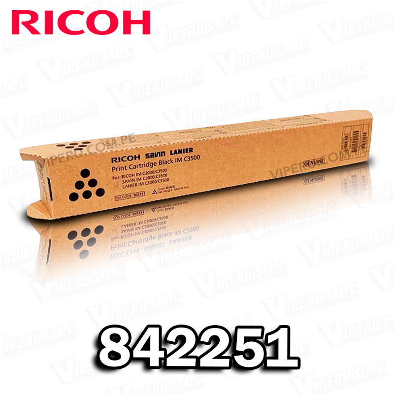 El Tóner Ricoh 842251 es un cartucho de tóner negro original Ricoh con alto rendimiento (aproximadamente 31 000 páginas) y está diseñado para utilizarse en impresoras láser multifunción de la serie Ricoh IM C3000 / IM C3500 y sus equivalentes de otras marcas.